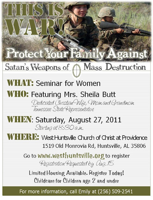 Today I am really soaking up the fellowship and feasting at a program called Polishing the Pulpit in Sevierville, TN. About 2400 people have assembled (or at least been present for part/all) for PTP and the singing is incredible. It must be a preview of the soundtrack of heaven! There has been lots of interest expressed here in our West Huntsville ladies seminar to be held on August 27th. We’ve entitled that seminar “This is War” because we are angry at the devil for his no-holds-barred-all-out-attack on our families and we are ready to shout, “…Over our dead bodies are you going to get into the hearts of our husbands and children and destroy our families.” Come hear practical ways to protect your family from immodesty, pornography, indecent forms of entertainment and the insatiable desire for material things that our culture feeds. There really may be something on the spiritual table at this seminar that can prevent disaster in your home at some point down the road. For some, it’s later than we may think. The information is below. Our ladies are working hard to make this available, extremely relevant, and cost effective (no charge for anything including housing). Only you can make it effective for your family. The deadline was officially yesterday, but consider this your special “Bless Your Heart” extension. Register today.